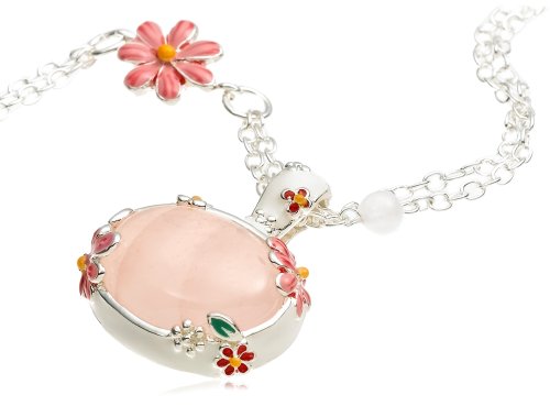 This sweet and girlish sterling silver pendant showcases an oval cabochon of pale pink rose quartz, surrounded by a white enamel frame with delicate pink flowers and green leaves. An additional enamel flower is stationed along the sterling silver double chain, along with petite polished rose quartz rounds. The necklace is 16 inches and fastens with a sturdy lobster-claw clasp. Pendant and chain can be worn together or separately. Detail
