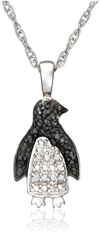 This darling penguin pendant is irresistible in 925 sterling silver, with shimmering black and white diamonds. Nine round diamonds (.05 cttw) detail this charming little fellow. The penguin dangles beneath a polished silver bail and presents on an 18-inch sterling silver rope chain. Detail